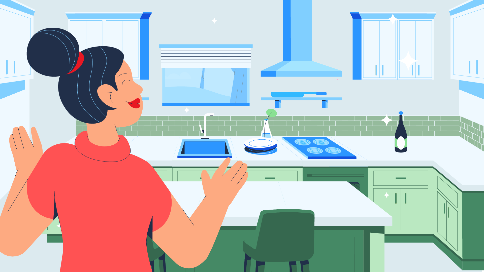 A woman in a red shirt smiling and waving in a modern renovated kitchen. She is happy with the new kitchen.