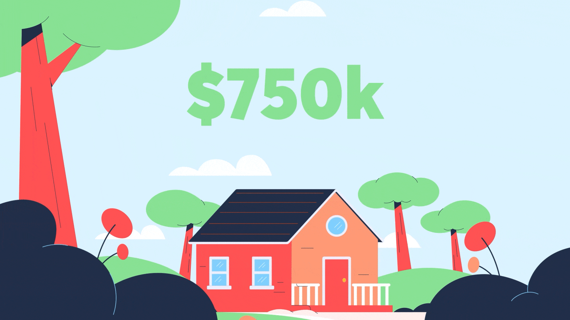 A colorful animated gif of a house renovating. Surrounded by trees and bushes with a large green dollar sign and the number 750k above it. Demonstrating how easy renovation financing is.