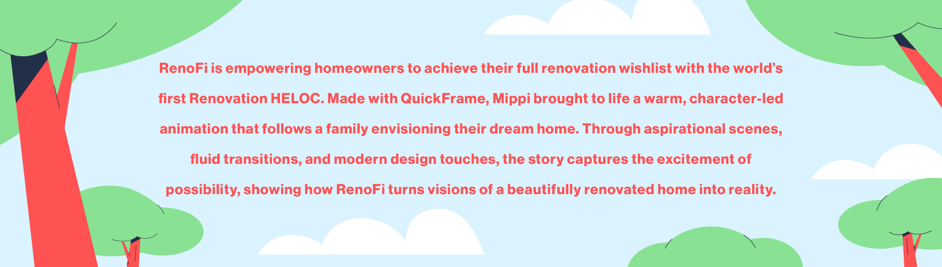 Text about RenoFi empowering homeowners to achieve renovation goals, featuring animated trees, clouds, and a blue sky background.