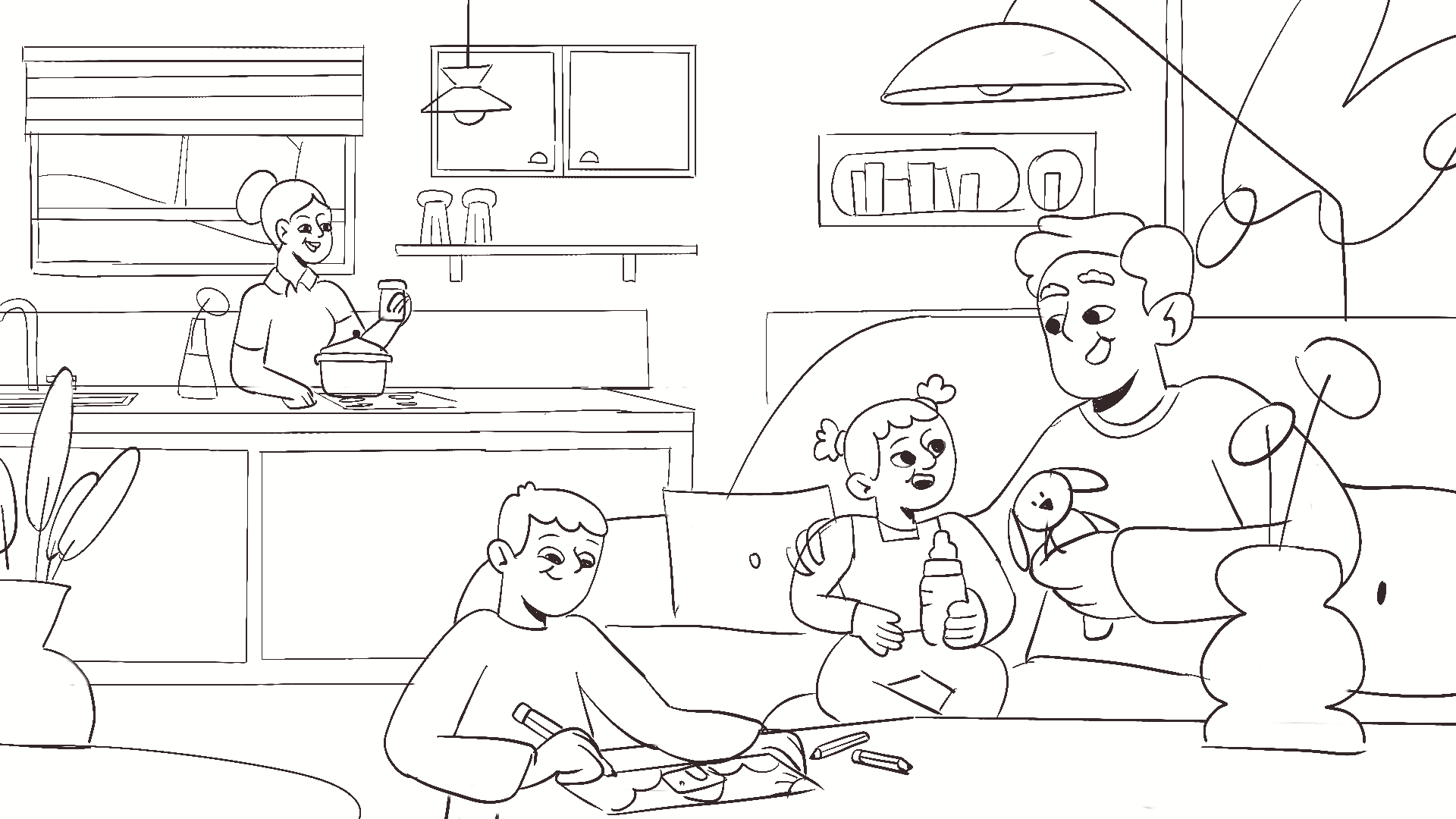 Line drawing of a family in living room with a kitchen background. A woman is cooking in the kitchen, and a man is sitting on the sofa holding a bunny plush toy. Two children are sitting on the floor; one with a crayon, and the other holding a bottle, engaging with the man.