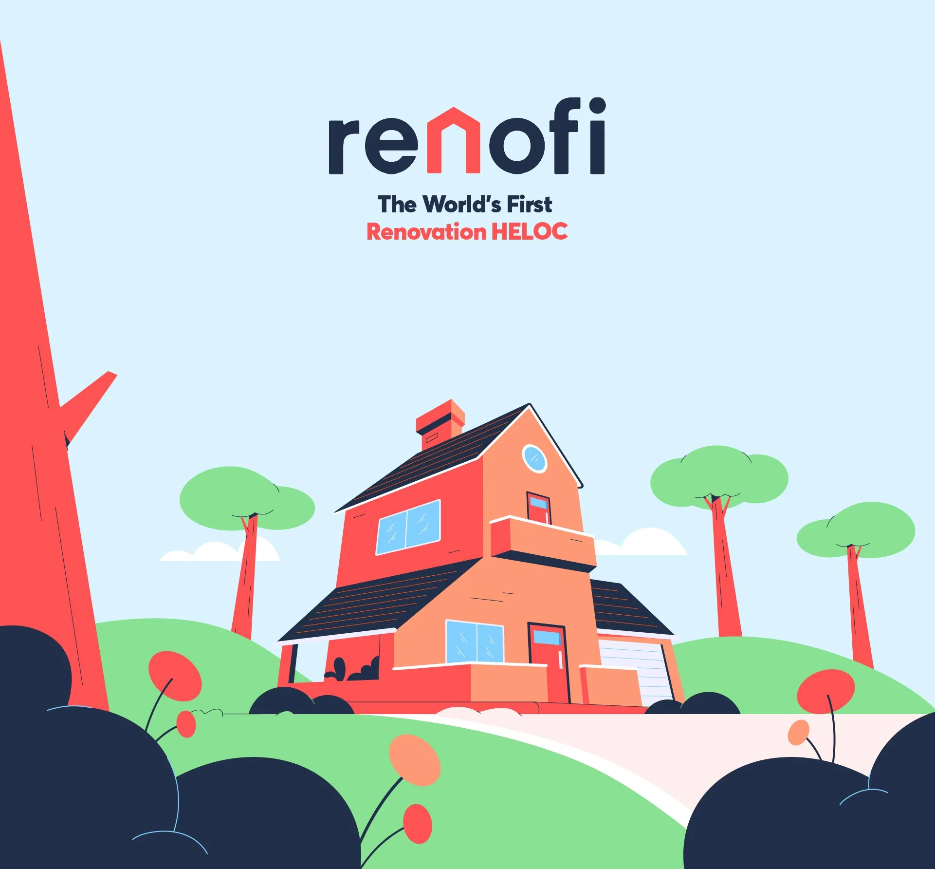 Illustration of a modern house on a green hill with trees and shrubs, with the text 'renofi' and 'The World's First Renovation HELOC' above.