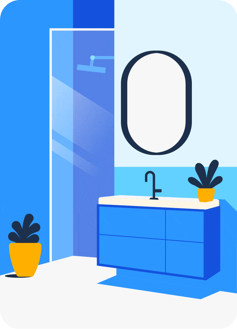 Endless scroll of modern interiors. A Bathroom with a blue vanity, a round mirror, two potted plants in yellow pots, a white countertop, and a shower area on the left side.